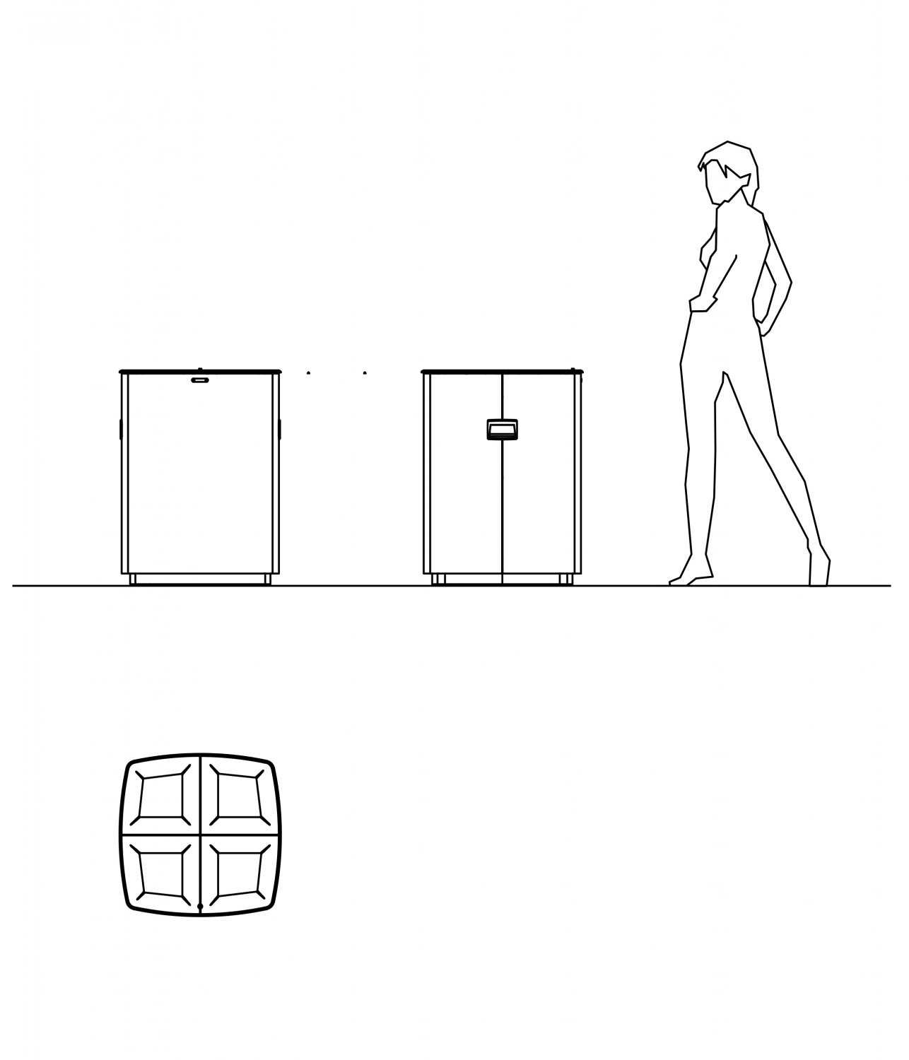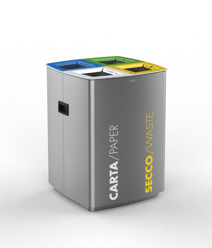 Zusammenstellung von Abfallbehältern, Stahlkonstruktion mit Stahlblech verkleidet. Ausgestattet mit drei oder vier Innenbehältern, die eine getrennten Sammlung gewährleisten. Die Innenbehälter sind quadratisch angeordnet. Zwei Gasdruckfedern unterstützen eine einfache Handhabung und Öffnung des Deckels.
