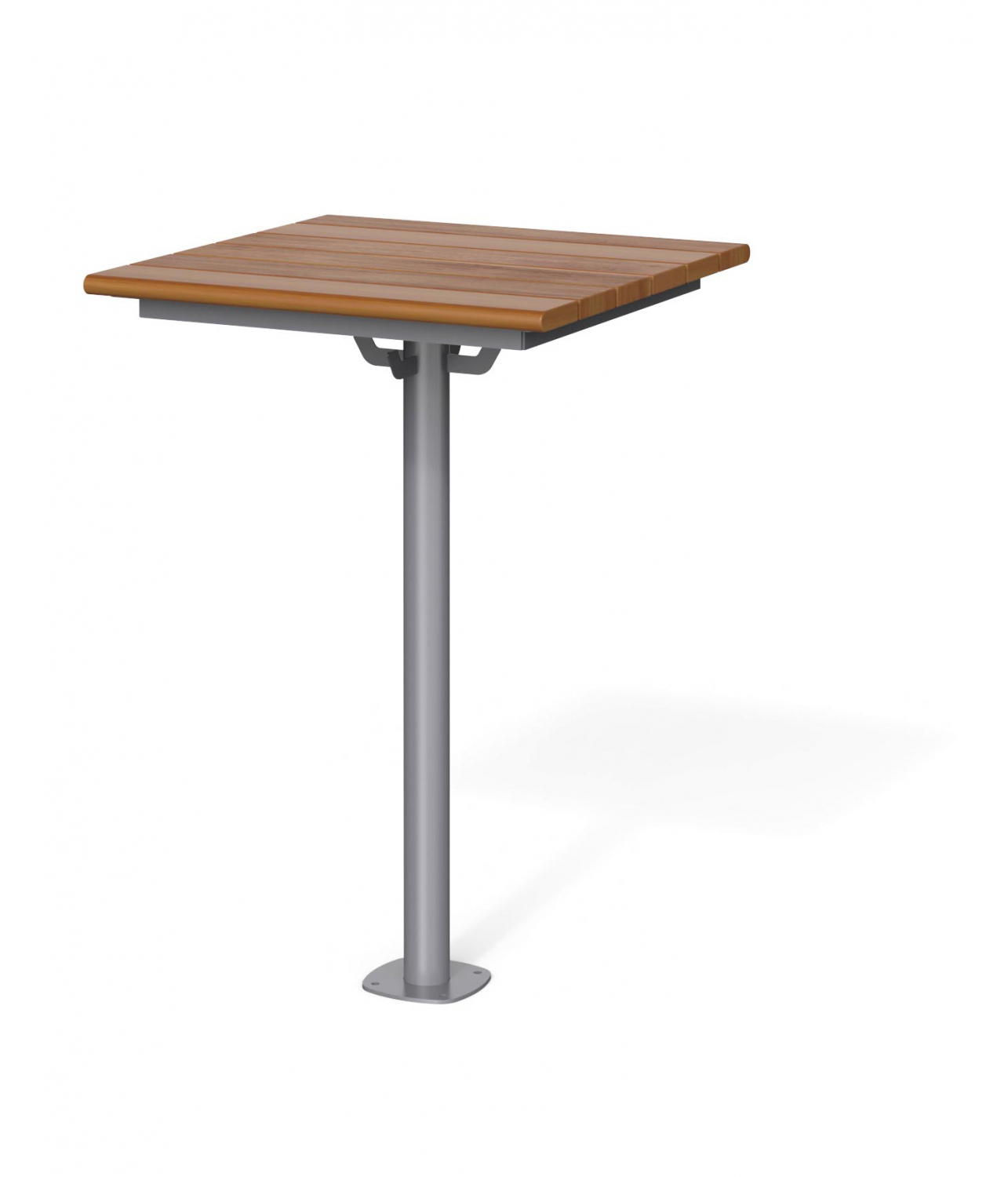 Die Tischauflage besteht aus Holzpanelen und ruht auf Stahlrundrohrstützen.