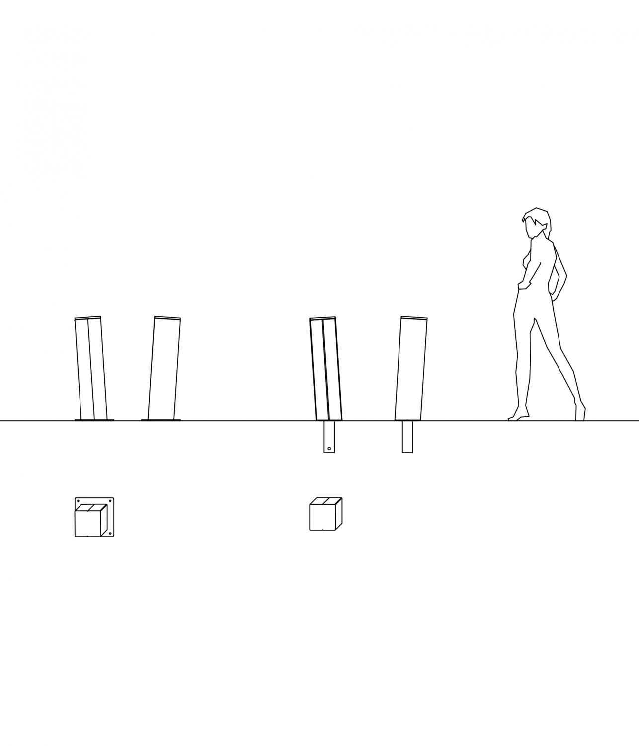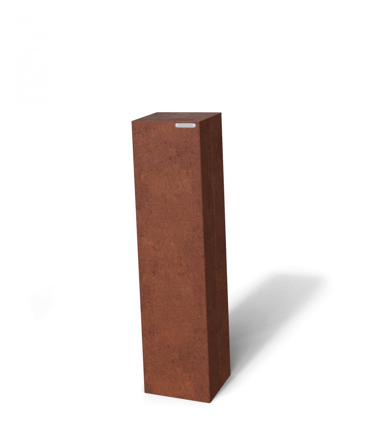 Schräger Fußgängerpoller mit quadratischem Sockel aus Stahlblech mit vertikalen Vertiefungen an beiden Seiten.