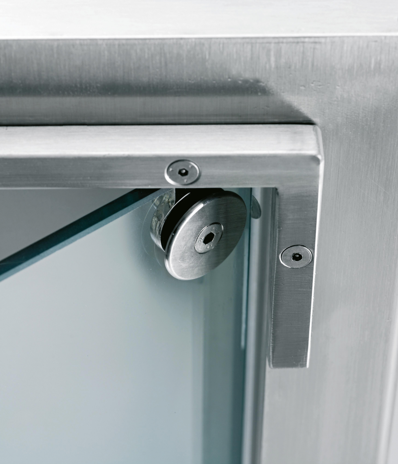 Modell II mit Türen aus gehärtetem Glas, Scharnieren und einem Verriegelungssystem.