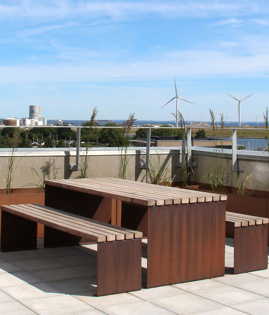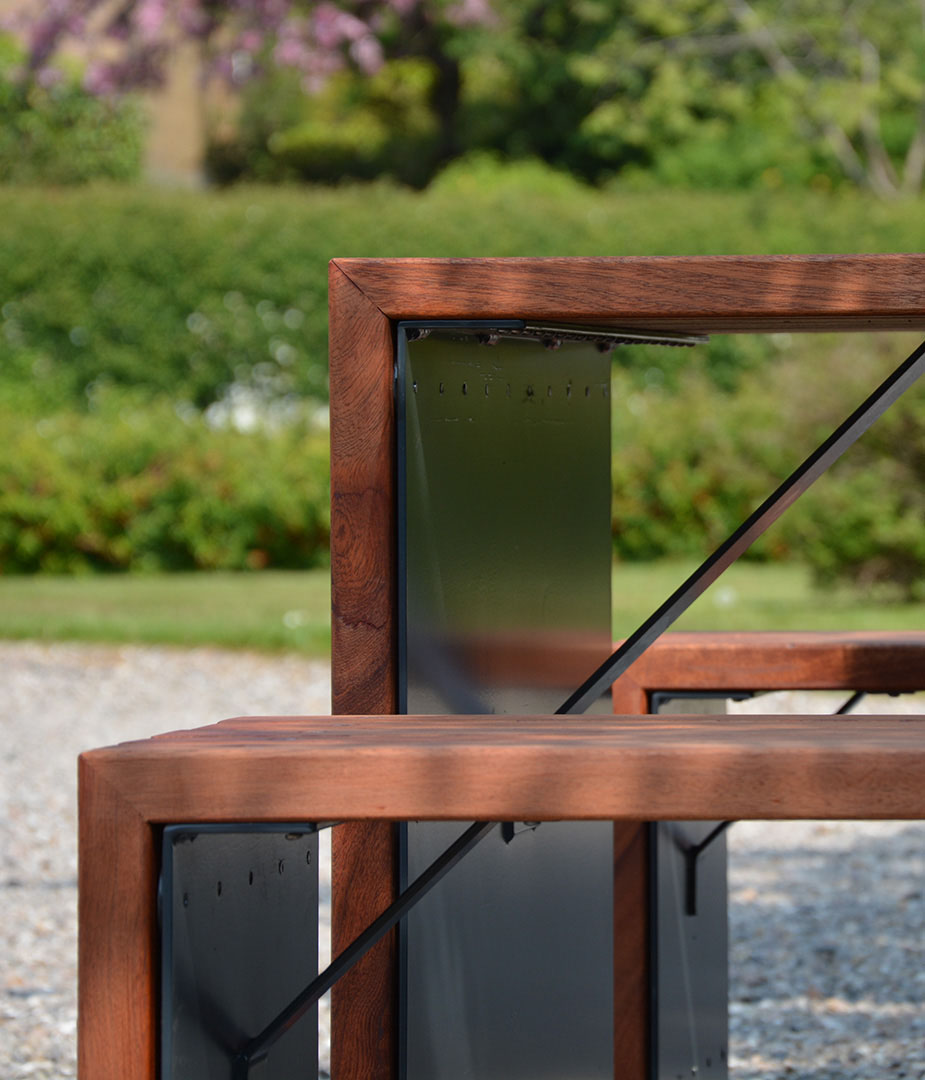 Tisch und Hockerbank haben ein Gestell aus Cortenstahl oder feuerverzinktem