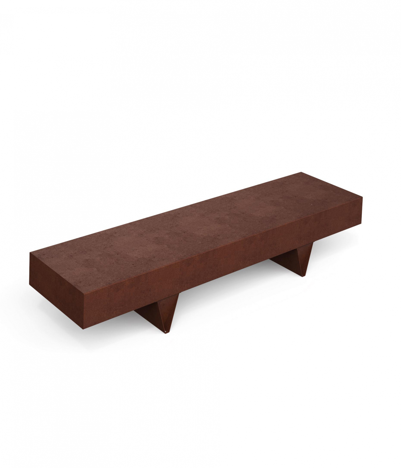 Modulare Bänke, ohne Rückenlehne, bestehend aus einer monolithischen Struktur und zwei Fußstützen aus Cortenstahl.