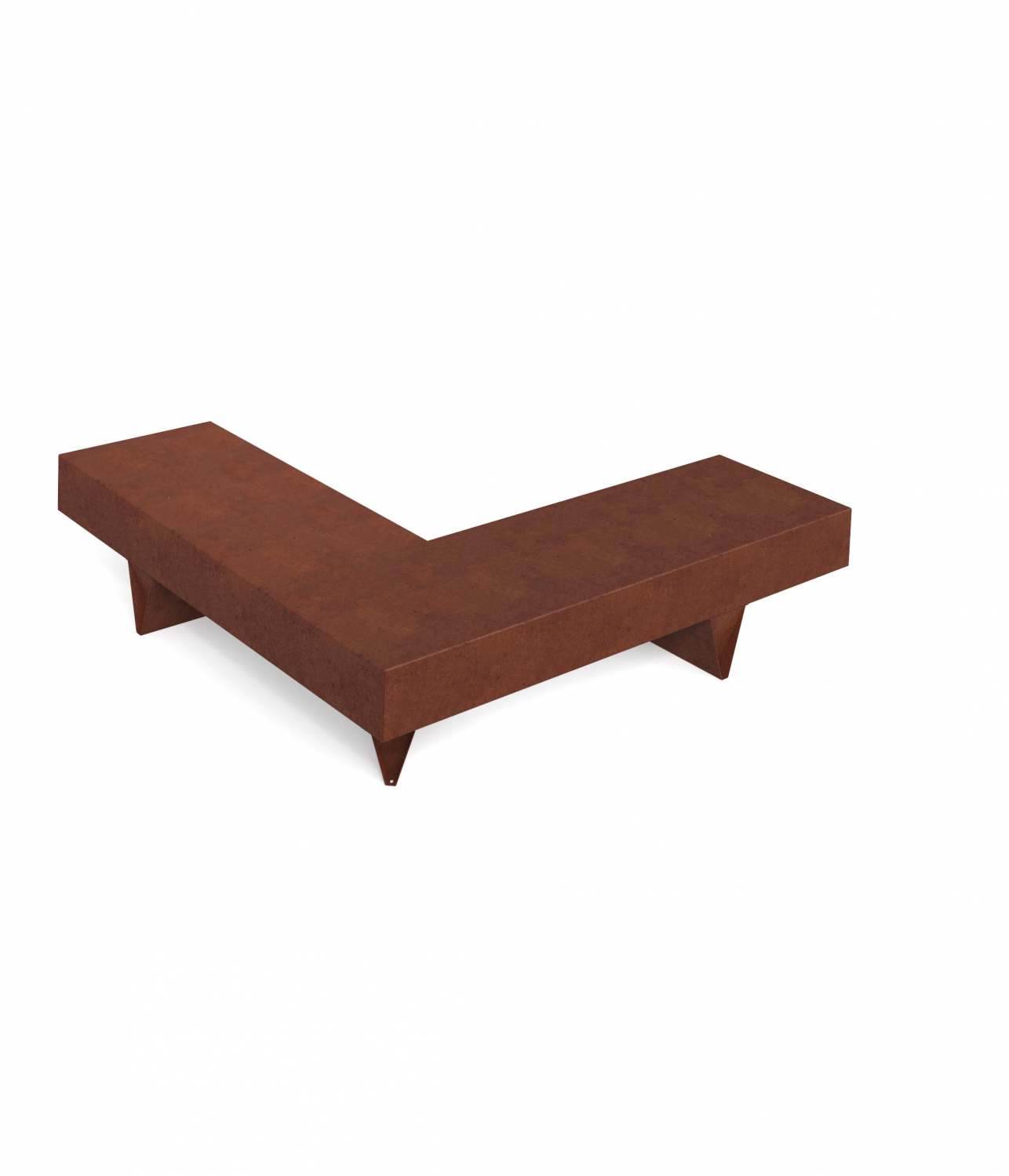 Modulare Bänke in „L-Form“, ohne Rückenlehne, bestehend aus einer monolithischen Struktur und drei Fußstützen aus Cortenstahl.