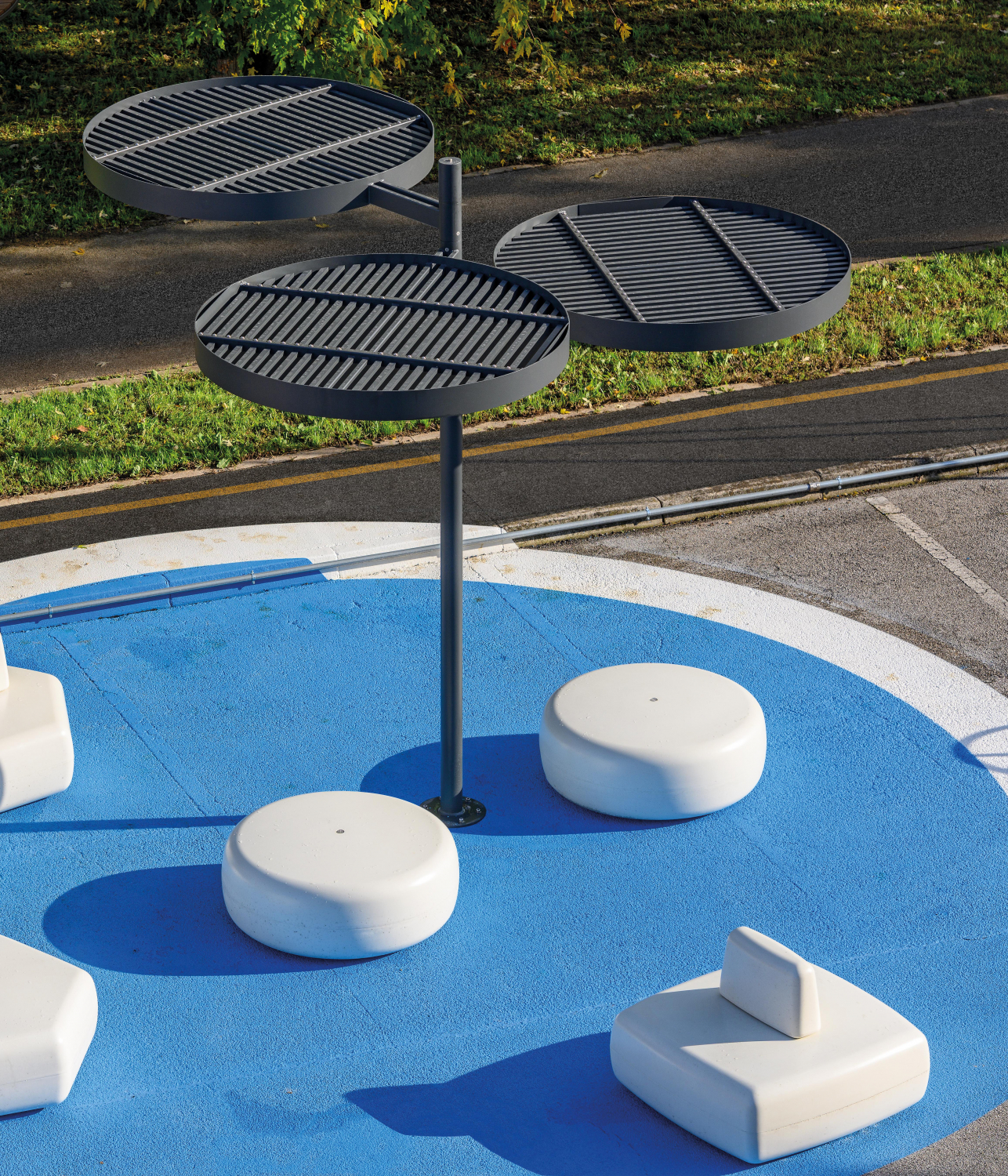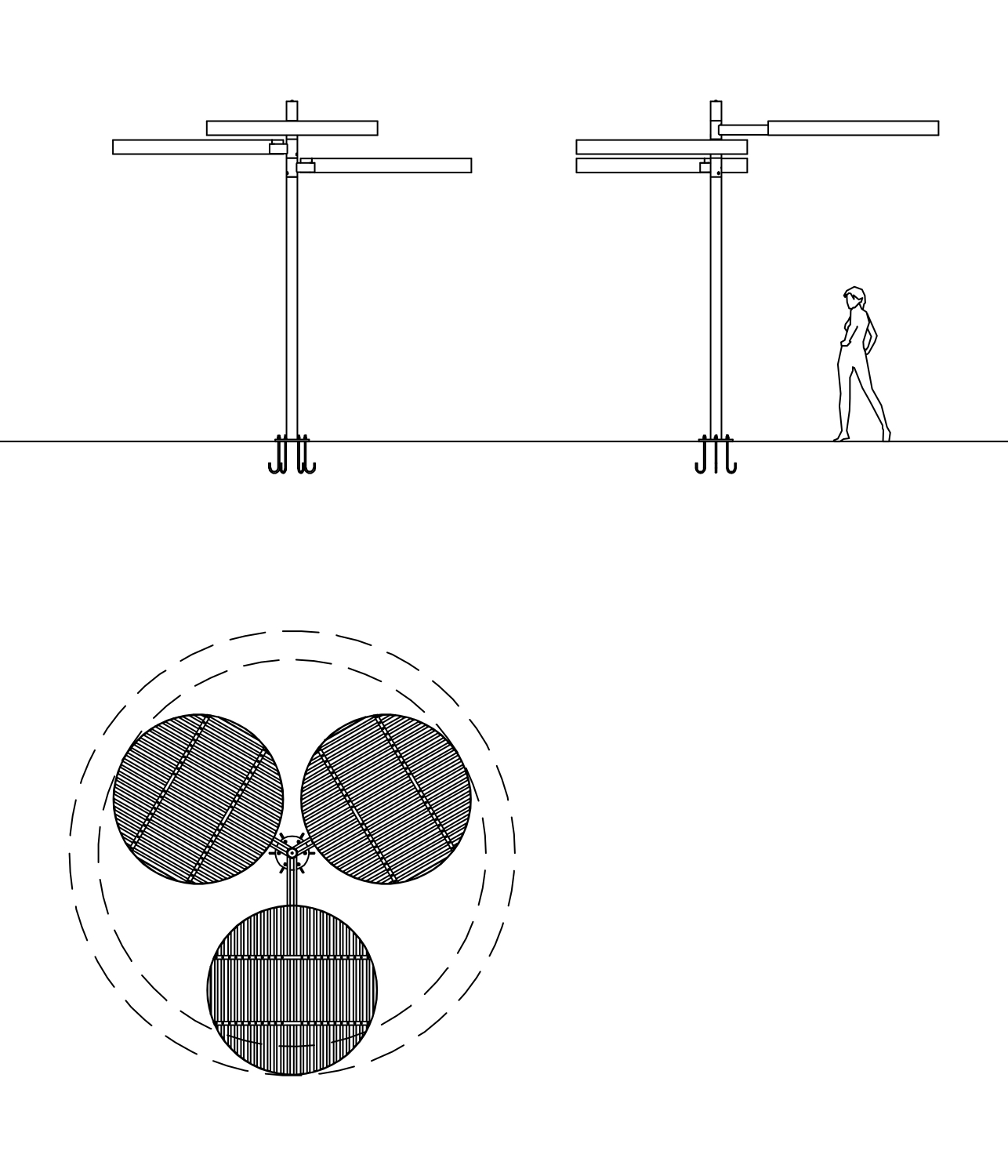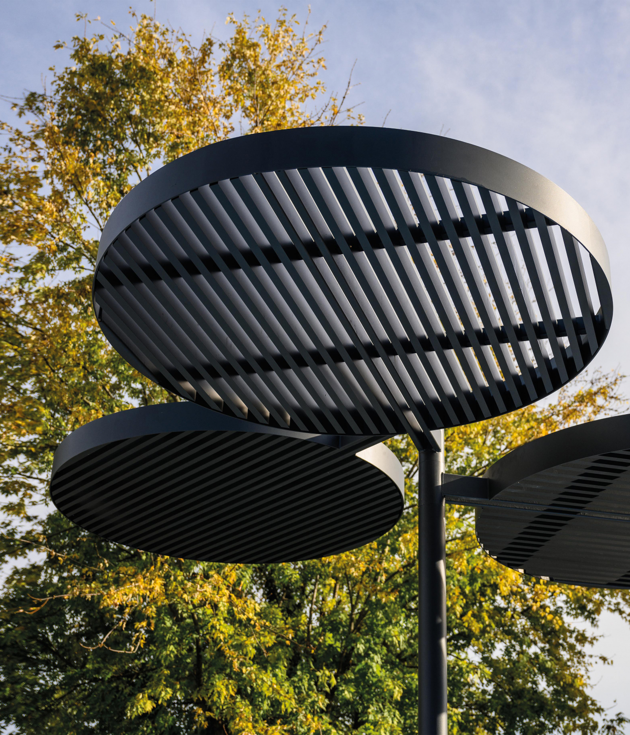 Beschattungssystem bestehend aus einer tragenden Säule mit drei runden Stahlrahmen, die in unterschiedlichen Höhen angeordnet und mit Aluminiumprofilen ausgestattet sind.