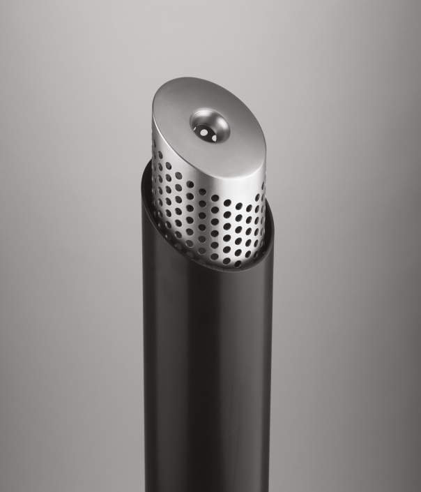 Zylindrischer Zigarettenbehälter aus rostfreiem Stahl, bestehend aus einem abnehmbaren Behälter mit Schloss und ausgestattet mit seitlichen Löchern für das Löschen von Zigaretten und einem oberen Schlitz.