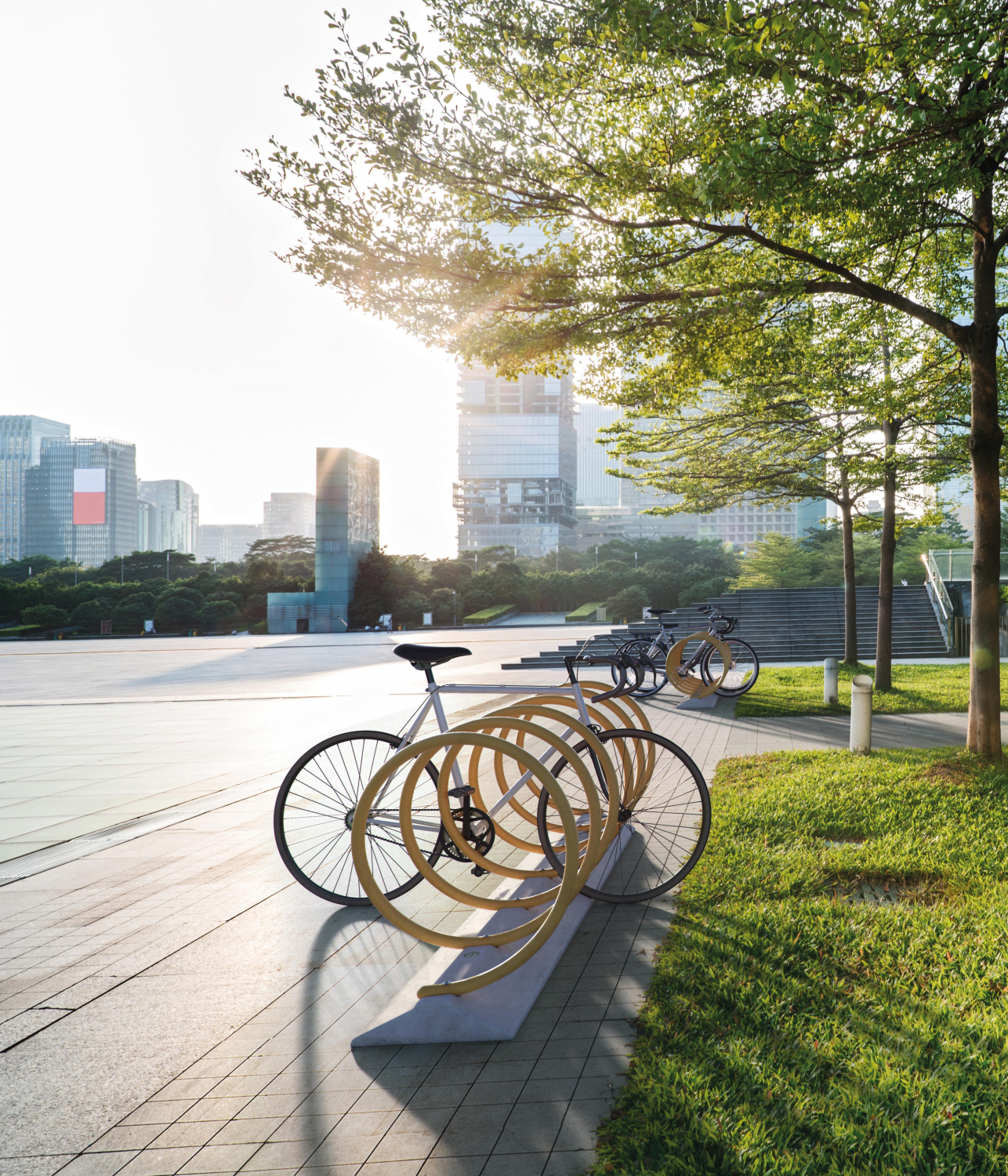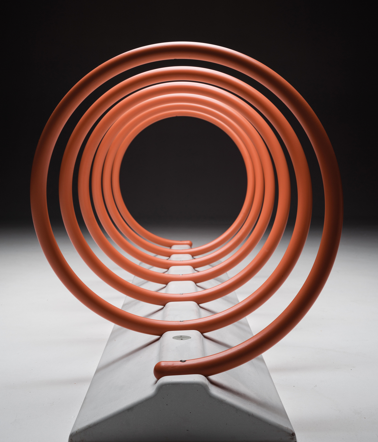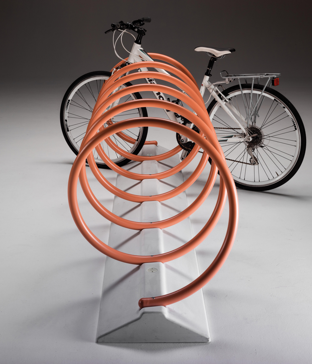 Fahrradträger aus Stahlrohr, bestehend aus einer durchgehenden Spirale, die auf gedrehten Stahlkegeln auf dem Boden ruht.