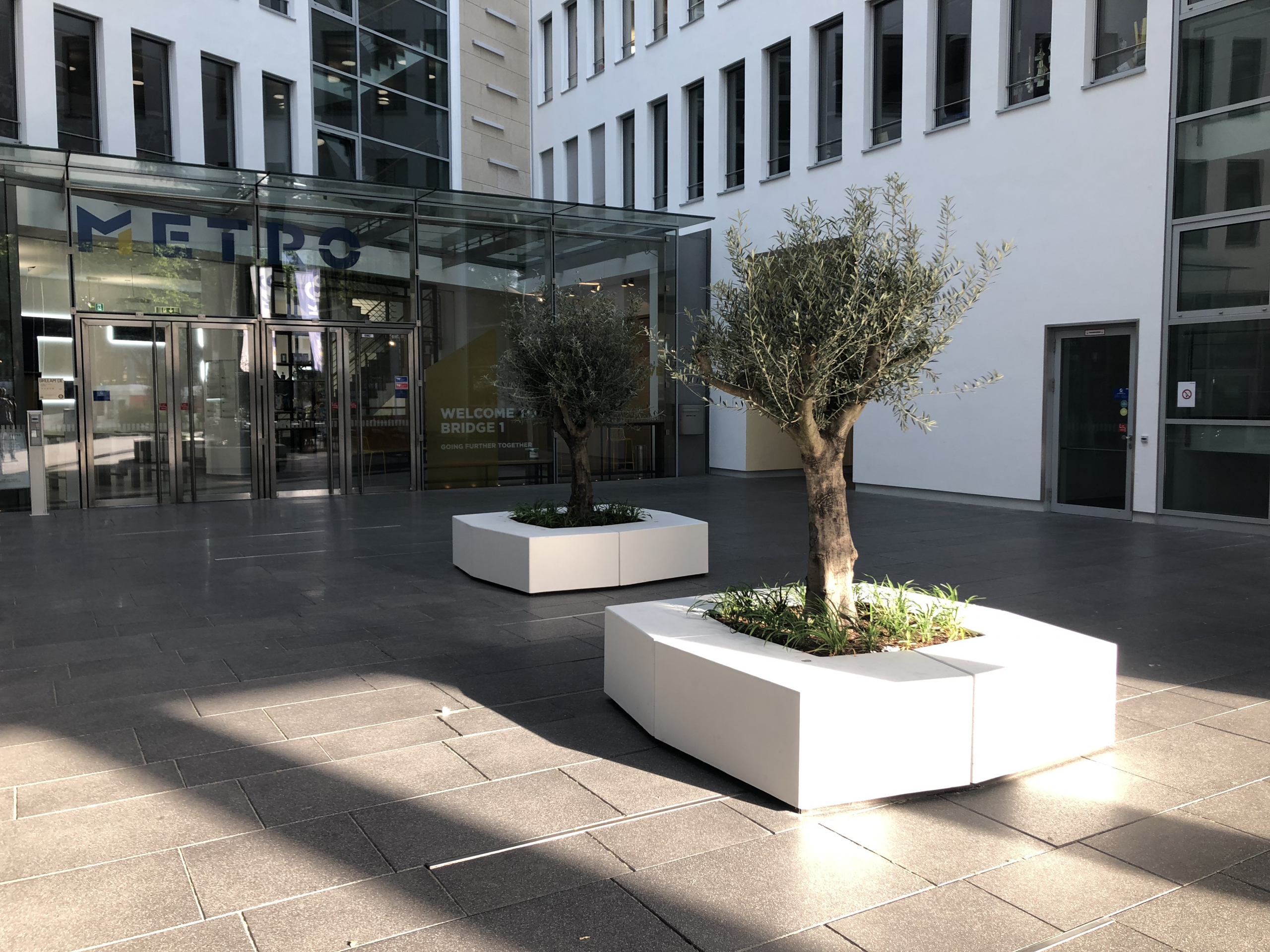Die Metro gehört zu Düsseldorf wie der Rhein zu dieser lebendigen Stadt. Der Handelsriese hat hier unter anderem seine Cash & Carry Zentrale, und für diese ein beeindruckendes Foyer erbaut. Von hier aus werden internationale Handelsströme gelenkt. Doch wer glaubt, dort dreht sich alles nur um Zahlen und Tabellen, der irrt: Im Foyer laden unsere Ruheinseln mit der UP! Beton Sitzbank die hektische Finanzwelt zu einem italienischen Moment der Laissez-faire am Fuße dichter, knorriger Olivenbäume ein.