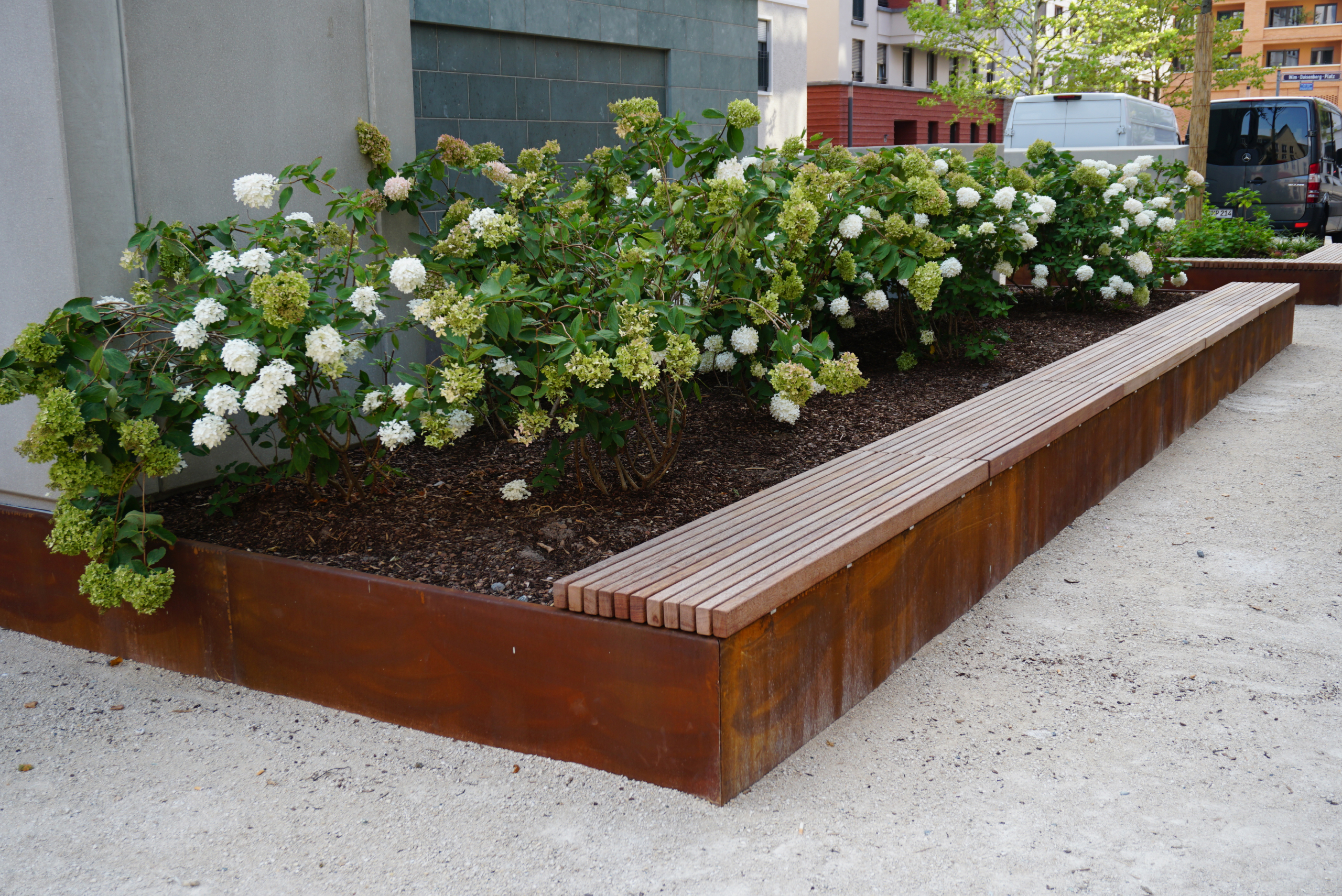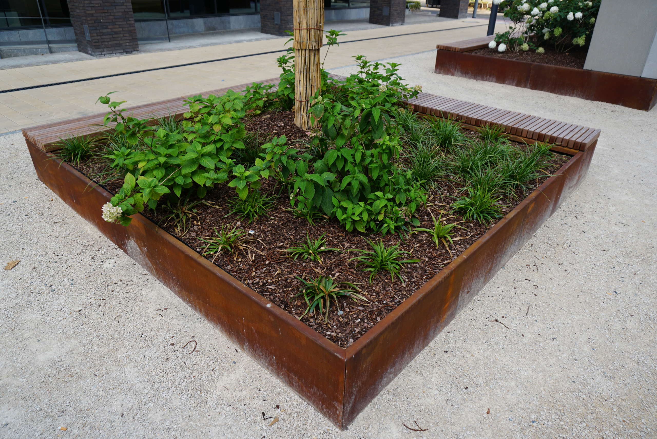Pflanzgefäße aus Corten-Stahl in rotbrauner Optik mit integrierten Sitzbänken aus Holz harmonieren perfekt mit der natürlichen Klinkerstein-Optik der Wohngebäude. Dank der vielen verschiedenen Module lassen sich die Freiflächen flexibel und kreativ gestalten. Gerade oder gebogene Elemente sowie Eckelemente setzen der Anordnung kaum Grenzen. Wahlweise mit quer oder längs montierter Holzbelattung verwandeln die Grandifioriere Module die Atmosphäre der Plätze und zaubern Weite, Abwechslung und Grün in den öffentlichen Raum.