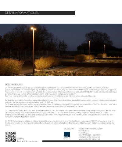 Die ANTO-Serie wurde vom dänischen Designstudio VE2 entworfen. Ziel war es, eine Mastleuchte als Ergänzung zur NYE-Pollerleuchte zu entwer-