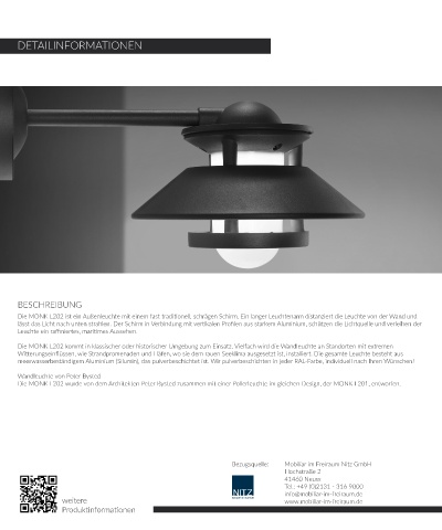 Die MONK L202 ist ein Außenleuchte mit einem fast traditionell, schrägen Schirm. Ein langer Leuchtenarm distanziert die Leuchte von der Wand und