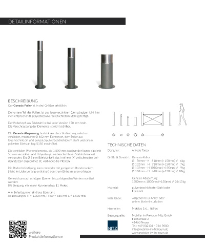 verbunden. Ein Ø 5 mm Edelstahlseil, das in einem “X” zwischen den bei- Größe & Gewicht: Genesis-Poller