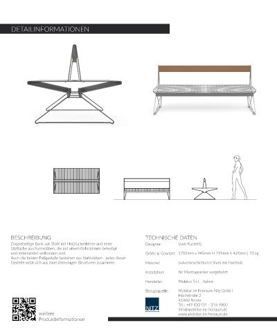 Doppelseitige Bank aus Stahl mit Holzrückenlehne und einer Designer: Uwe Kuckertz