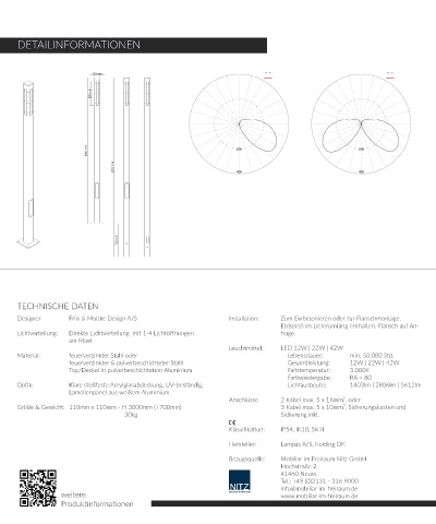 Größe & Gewicht: 110mm x 110mm - H 3000mm (+700mm) 3 Kabel max. 5 x 10mm², Sicherungskasten und
